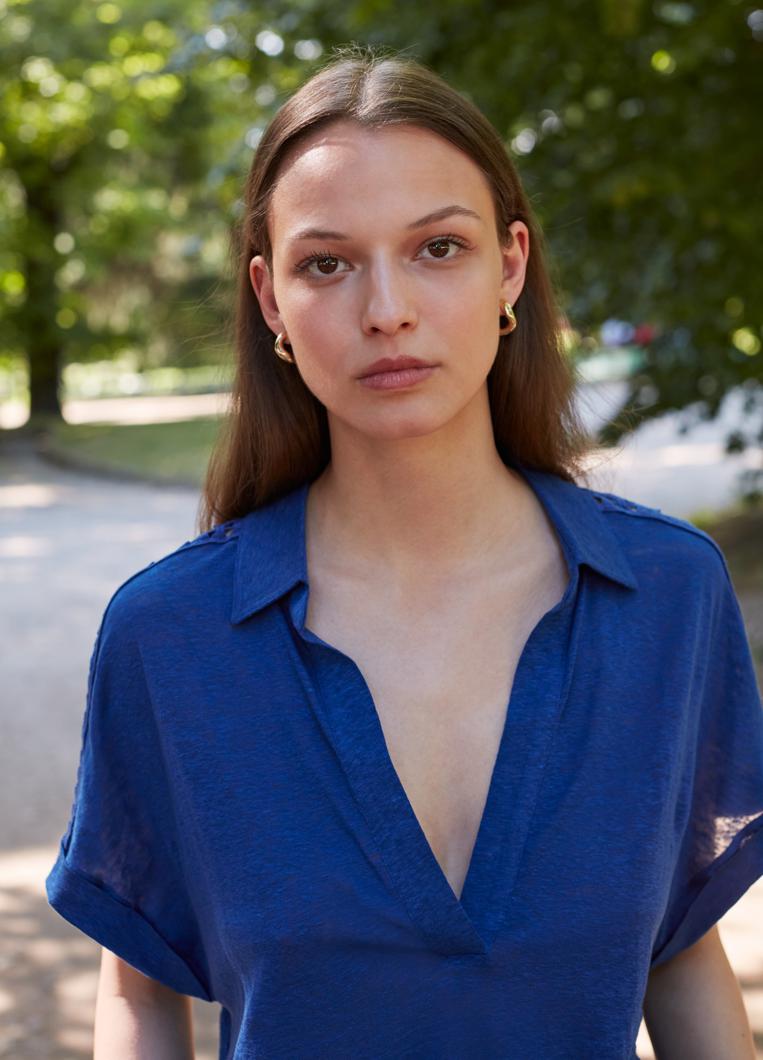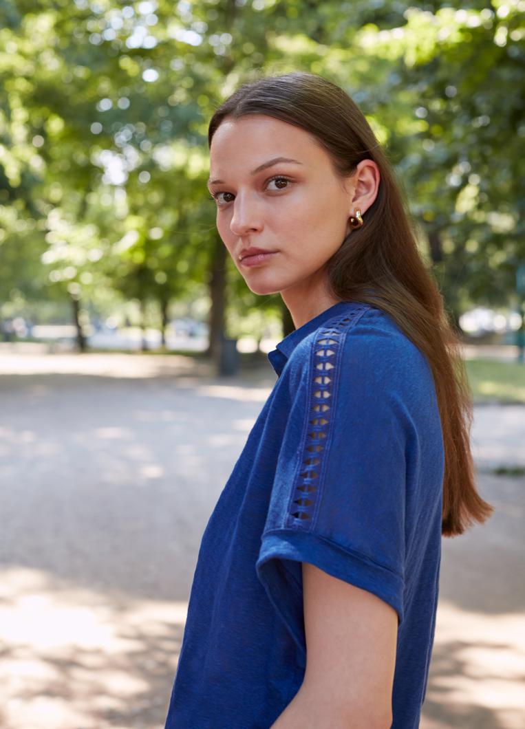 Λιτή εμφάνιση, ιταλικό κόψιμο και 100% λινό — αυτή η μπλούζα σε μπλε σοδαλίτη είναι ό,τι ψάχνεις για το καλοκαίρι.