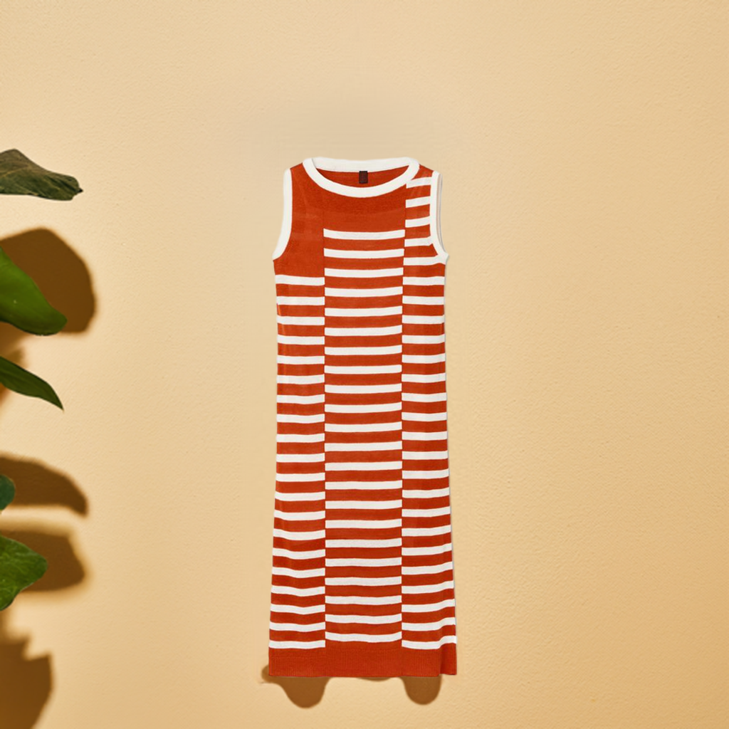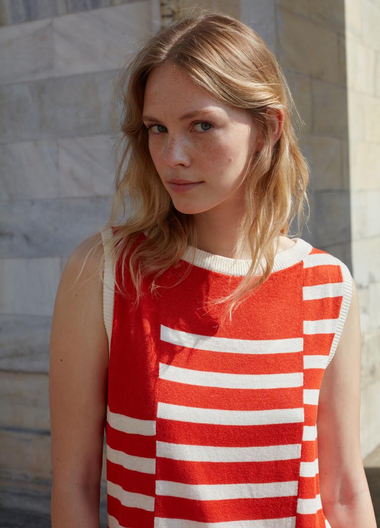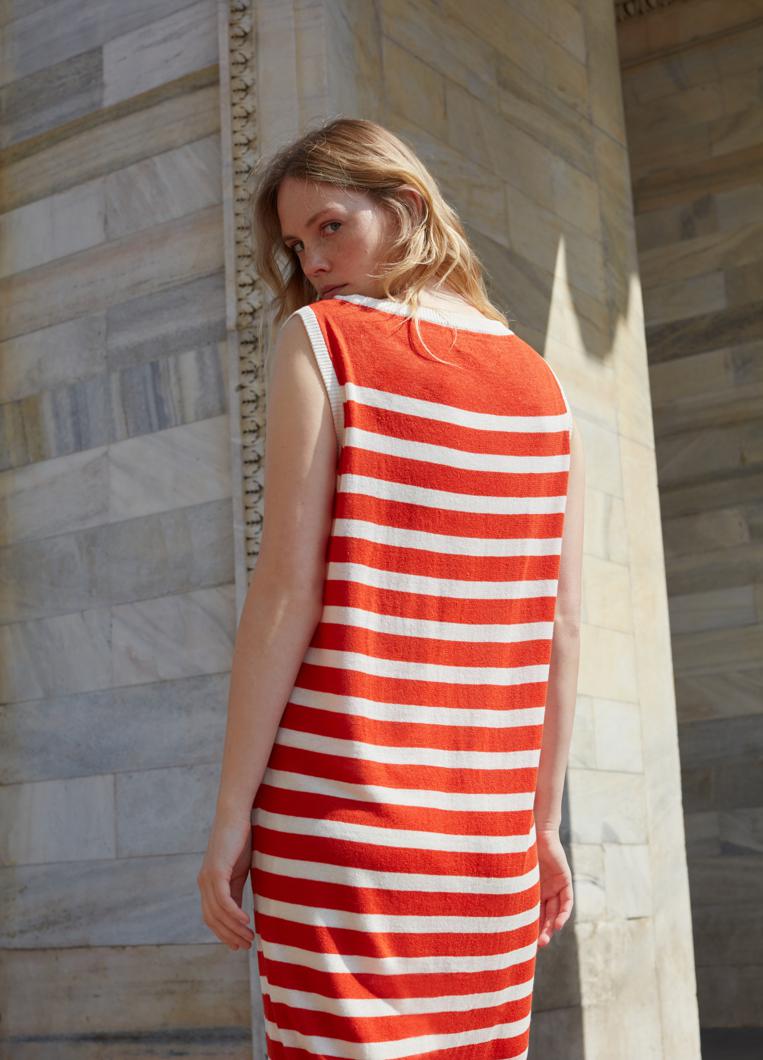 Φτιαγμένο από 87% λινό, αυτό το φόρεμα είναι φτιαγμένο για τη ζέστη – αέρινο, απλό, με χαρακτήρα. Ο συνδυασμός υπόλευκου και κόκκινου χρώματος του δίνει μια φωτεινή αλλά και κομψή παρουσία.