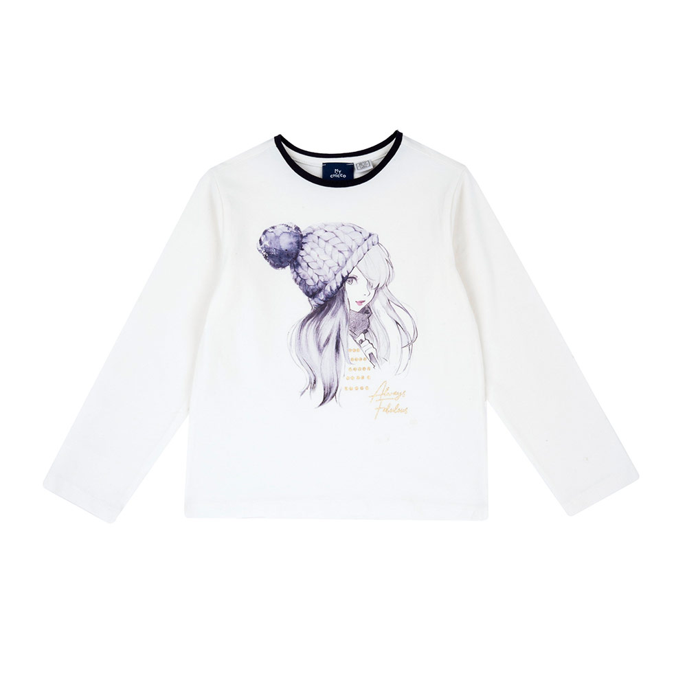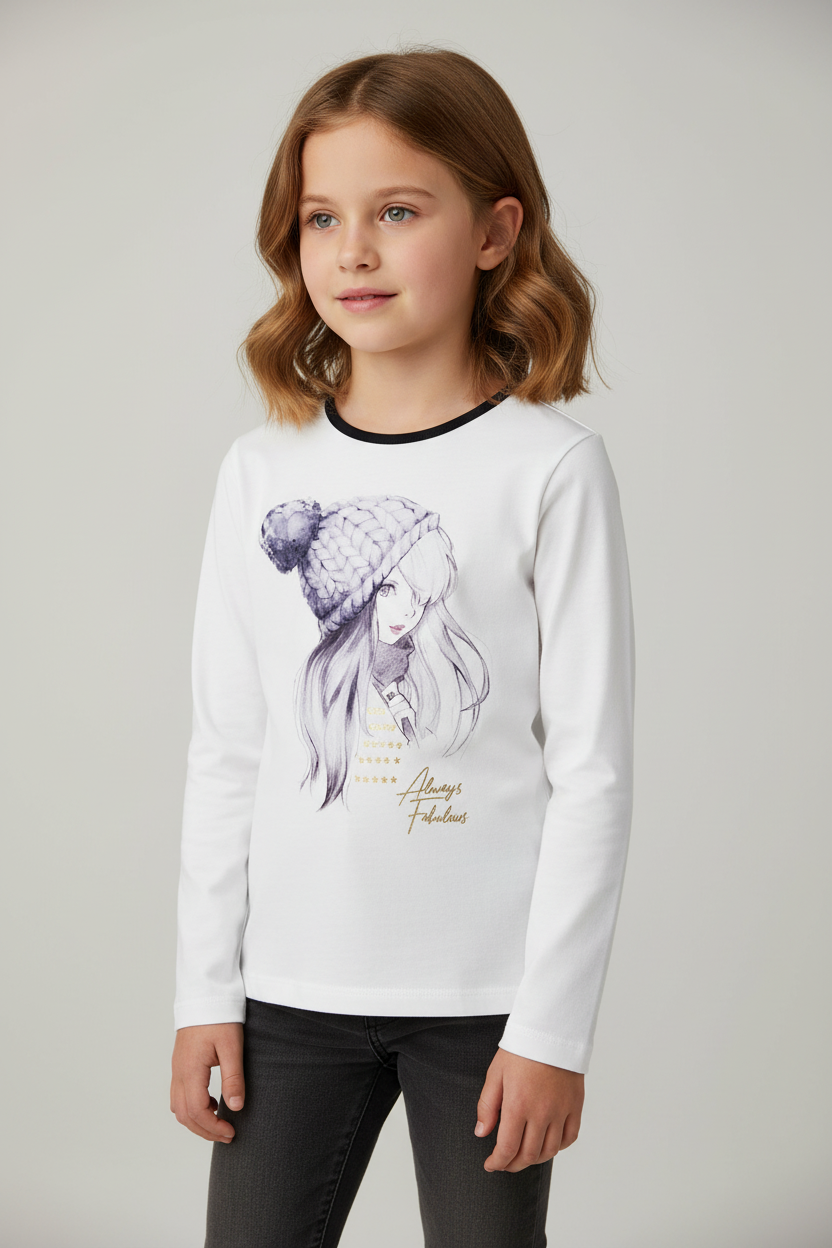 Изчистена бяла блуза с дълъг ръкав и деликатна илюстрация отпред. Рисунката е фина и стилна, с леко артистично излъчване.
