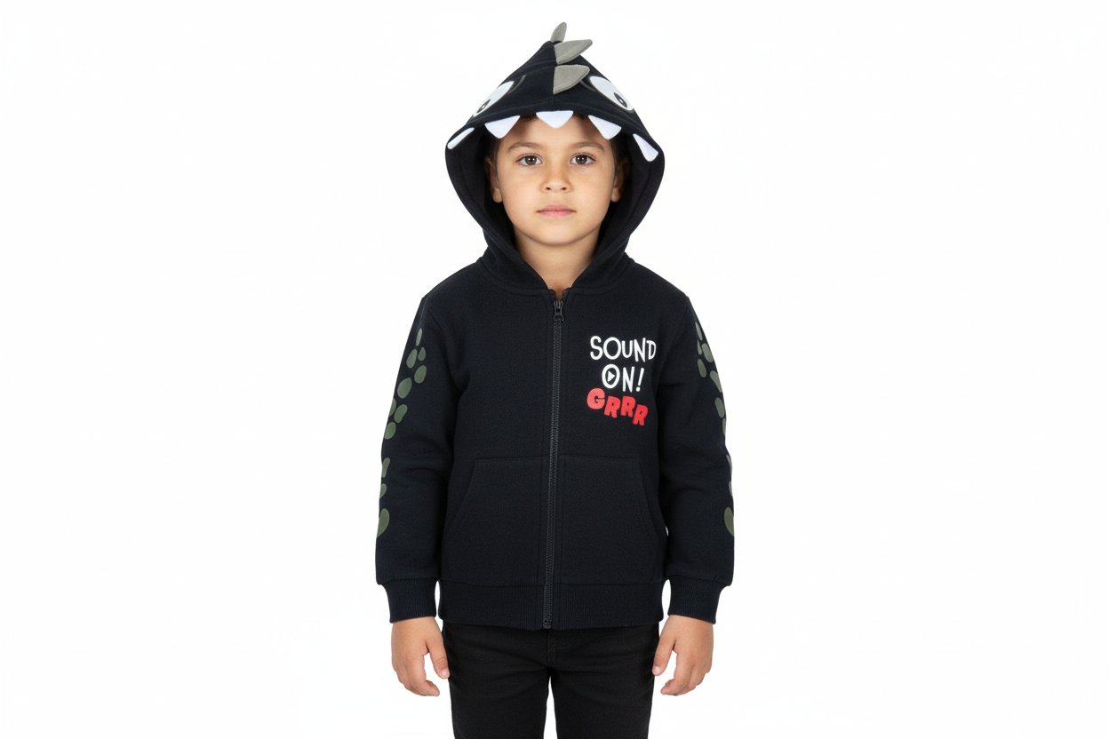 Това е худи с характер. Качулката оформя лице на динозавър – с очи, зъби и шипове – и веднага става любимата дреха за обличане, без пазарлъци.