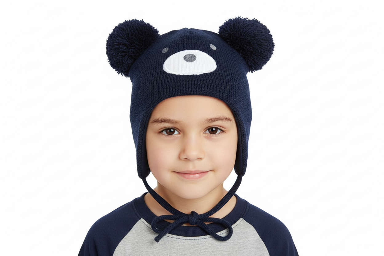 Тази детска плетена шапка е изработена в неутрален бежов цвят и е подходяща за студените дни. Моделът е с оформени ушички отгоре и плетена илюстрация на животинско лице отпред, което придава нежен и закачлив вид.